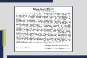 “A Comissão Especial de Licitação, instituída pela portaria no 362/95, do Presidente do Tribunal Superior Eleitoral, torna público a realização da Licitação Internacional de n° 002/95, na modalidade de concorrência, do tipo técnica e preço, com o fim de escolher a proposta mais vantajosa para o fornecimento de equipamentos de informática denominados Coletor Eletrônico de Voto (CEV).”