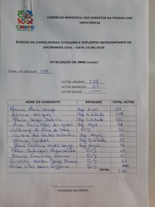 A eleição para o Conselho Municipal dos Direitos da Pessoa com Deficiência (CMDPD) de Paulínia definiu, neste sábado (14), os novos representantes titulares e suplentes da sociedade civil para o biênio 2025-2027. O pleito foi realizado no Centro de Convivência Tia Lídia e contou com a participação de 589 votantes — 588 votos válidos e um em branco.