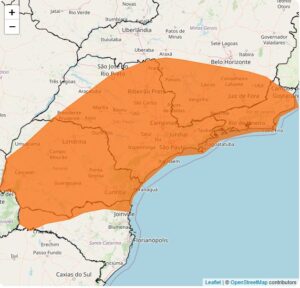 O alerta entra em vigor às 9h de domingo (23) e segue até as 10h de terça-feira (25), podendo ser estendido conforme a evolução das condições climáticas.