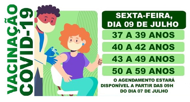 A Secretaria Municipal de Saúde de Paulínia vai abrir nesta quarta-feira, dia 7, às 9h, agendamento para imunização na sexta-feira, 9 de julho, da 1ª Dose para: