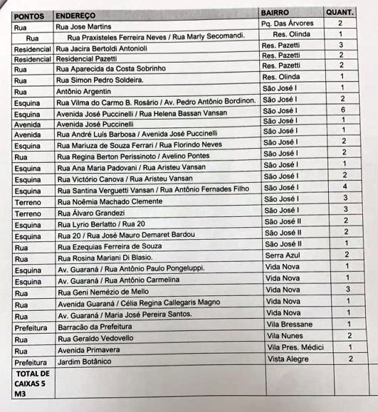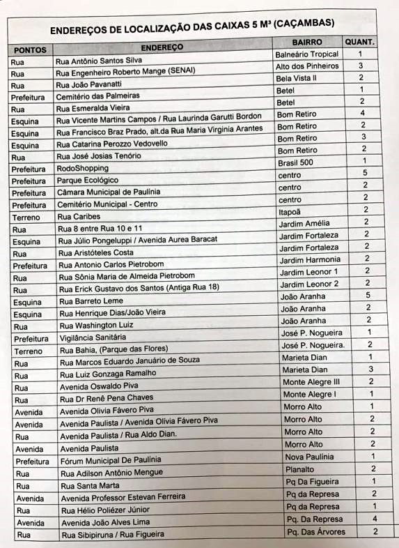 A Prefeitura de Paulínia informou que as caçambas foram remanejadas de lugar. Ao todo, a população conta com 150 unidades que ficam disponíveis em pontos estratégicos do município, porém, nos bairros citados não houve reposição: moradores do Monte Alegre II encontram o dispositivo no Monte Alegre I e os residentes do Nosso Teto podem utilizar as caçambas disponíveis no Monte Alegre III. (Confira abaixo os endereços).