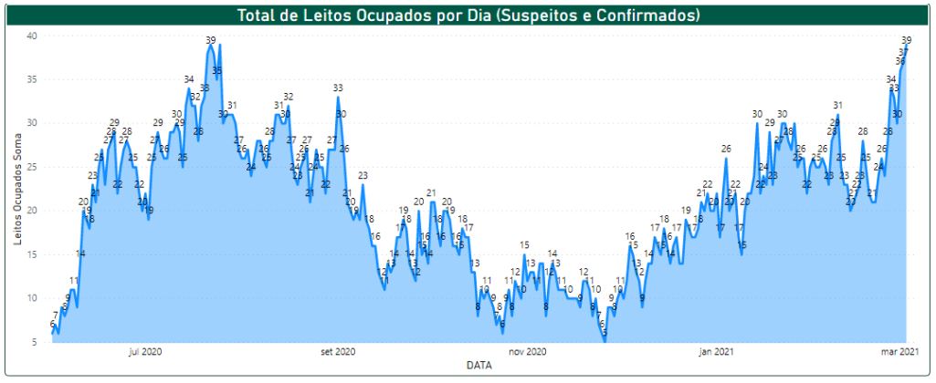 O número de leitos ocupados por pacientes confirmados e suspeitos da Covid-19, no Hospital Municipal de Paulínia (HMP) voltou a subir em meados de dezembro de 2020. No dia 3 de março, atingiu a ocupação de 39 leitos. Observa-se que em 2020 durante a primeira onda, o número de leitos ocupados atingiu seu pico entre os meses de julho e setembro de 2020, sendo que no mês de julho até 39 leitos estavam ocupados durante o mesmo período. Em meados de setembro, ocorreu queda no número de leitos ocupados.