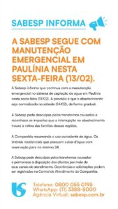 A Sabesp informou que segue realizando manutenção emergencial no sistema de captação de água do município. Segundo a companhia, a previsão é que o abastecimento seja normalizado gradualmente a partir de sábado (14).