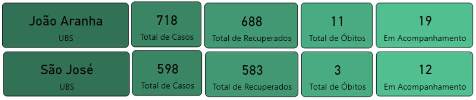 A Região de Saúde do São José possui estimativa de 22 mil habitantes e é composta pelas UBS São José e UBS João Aranha. Até o dia de publicação deste boletim, a região havia registrado 1.316 casos confirmados, 14 óbitos, 1.271 recuperados e 31 em acompanhamento.