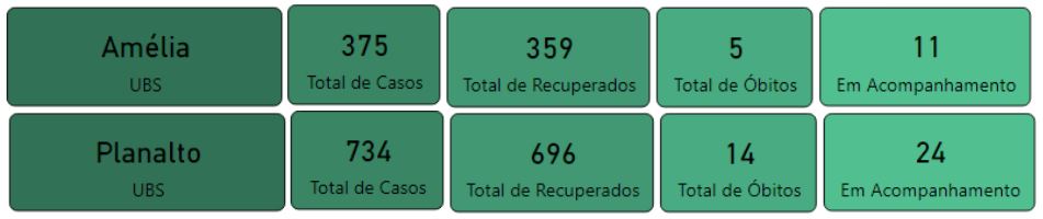 A Região de Saúde do Planalto possui estimativa de 21 mil habitantes e é composta pelas UBS Amélia e UBS Planalto. Até o dia de publicação deste boletim, a região havia registrado 1.109 casos confirmados, 19 óbitos, 1.055 recuperados e 35 em acompanhamentos.